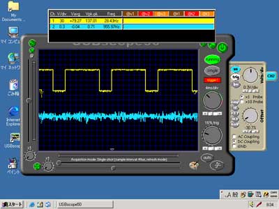 ![]() | 220マイクロ電解コンデンサを入れて軽減した波形、電源のリップルは1V以下に下がる。